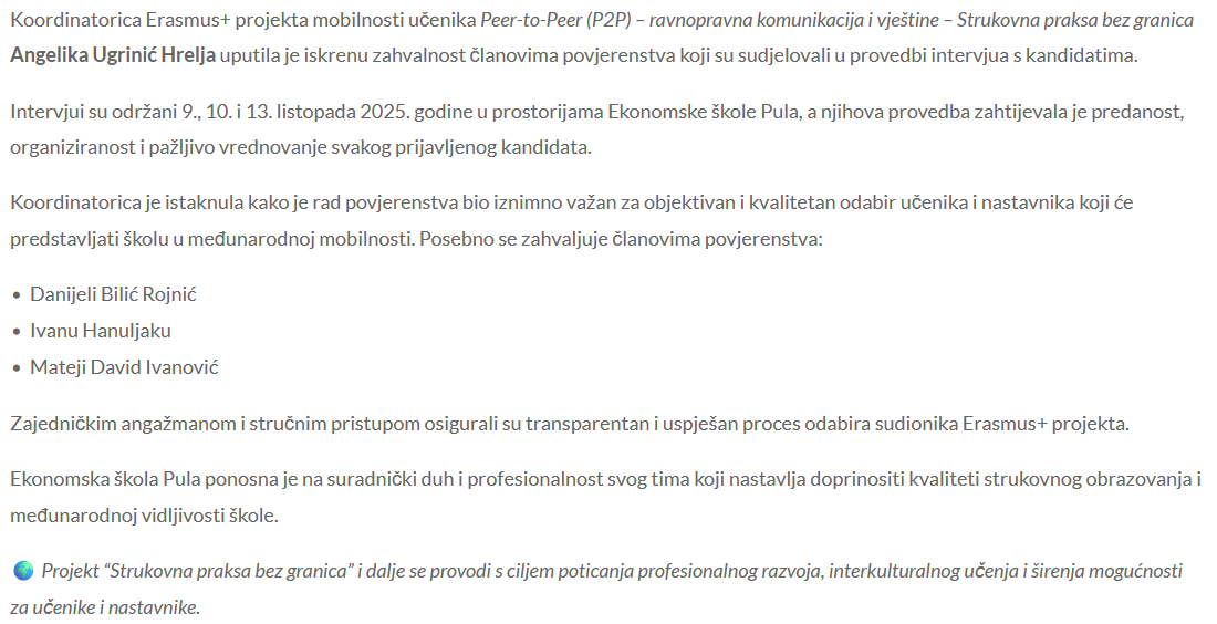 ZAHVALA POVJERENSTVU ZA PROVEDBU INTERVJUA U OKVIRU ERASMUS+ PROJEKTA